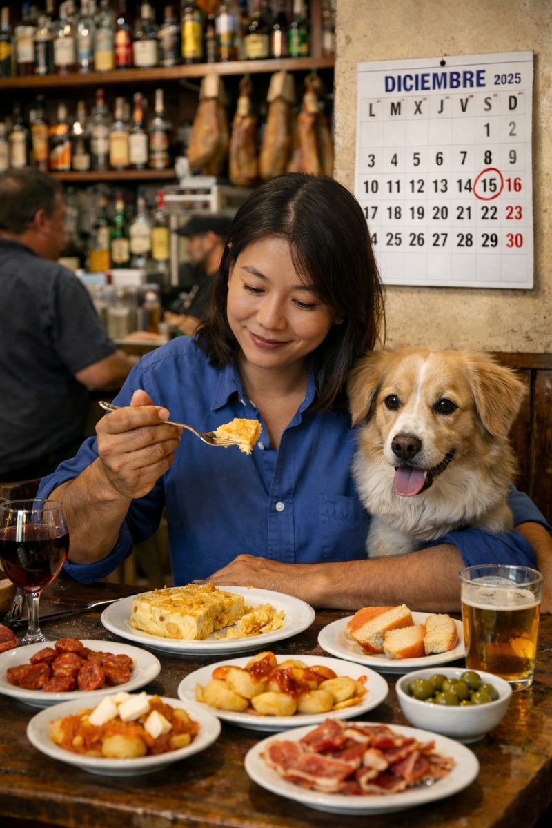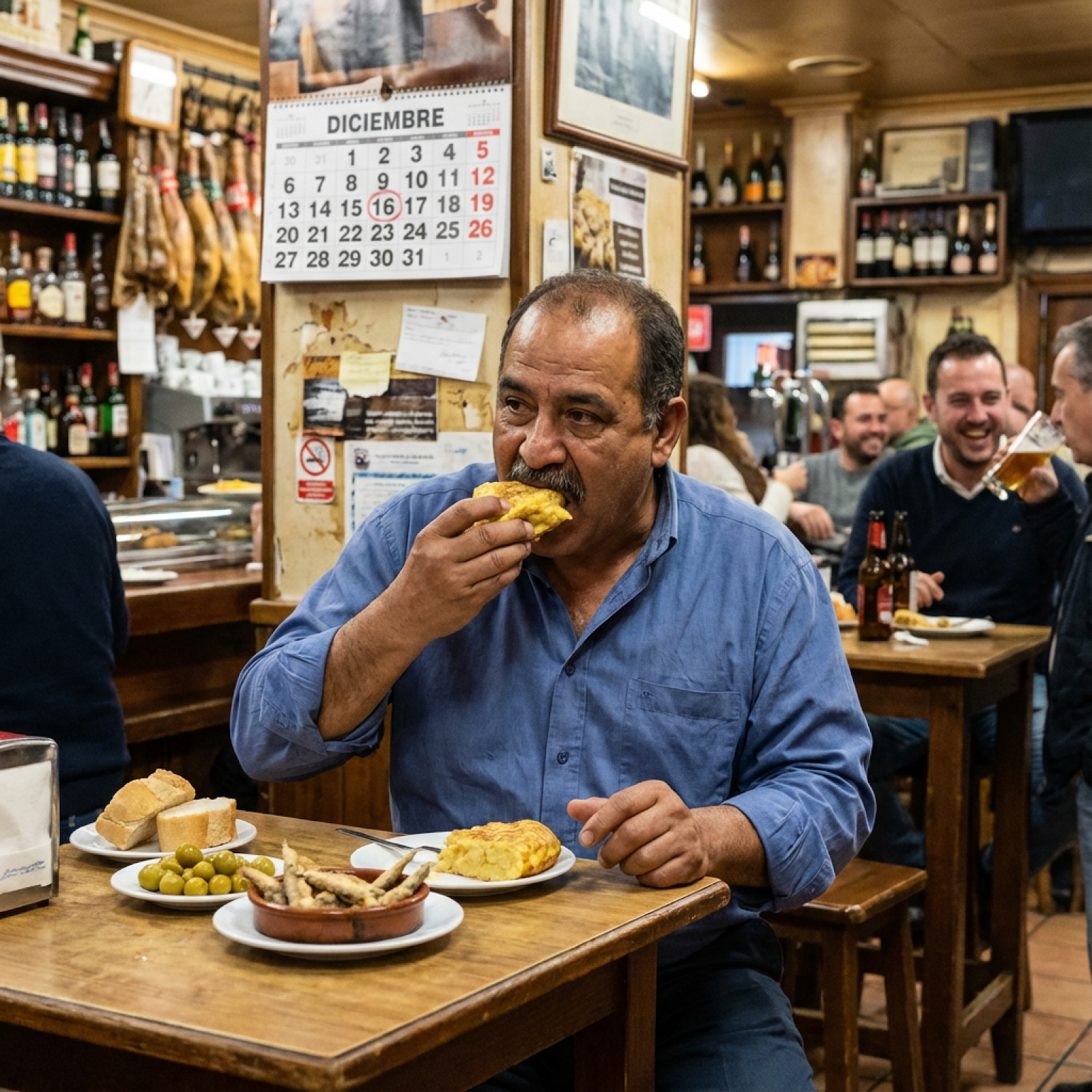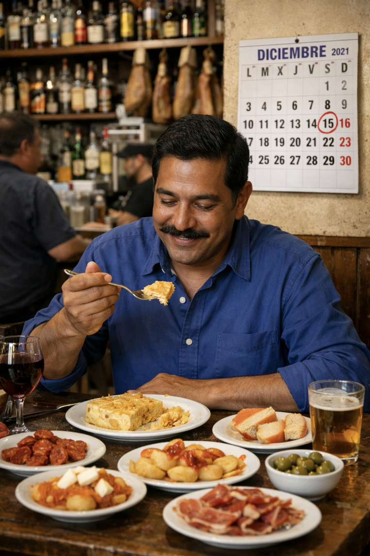 A man eating in a Spanish bar. He has medium-brown skin, a mustache, and is wearing a blue button-up shirt. He is eating Spanish potato omelette, with several plates of food on the table. The bar looks real and busy, with bottles and objects in the background. On the wall in the background, there is a calendar for December. The number 16 is circled with a marker. Realistic photo style.
