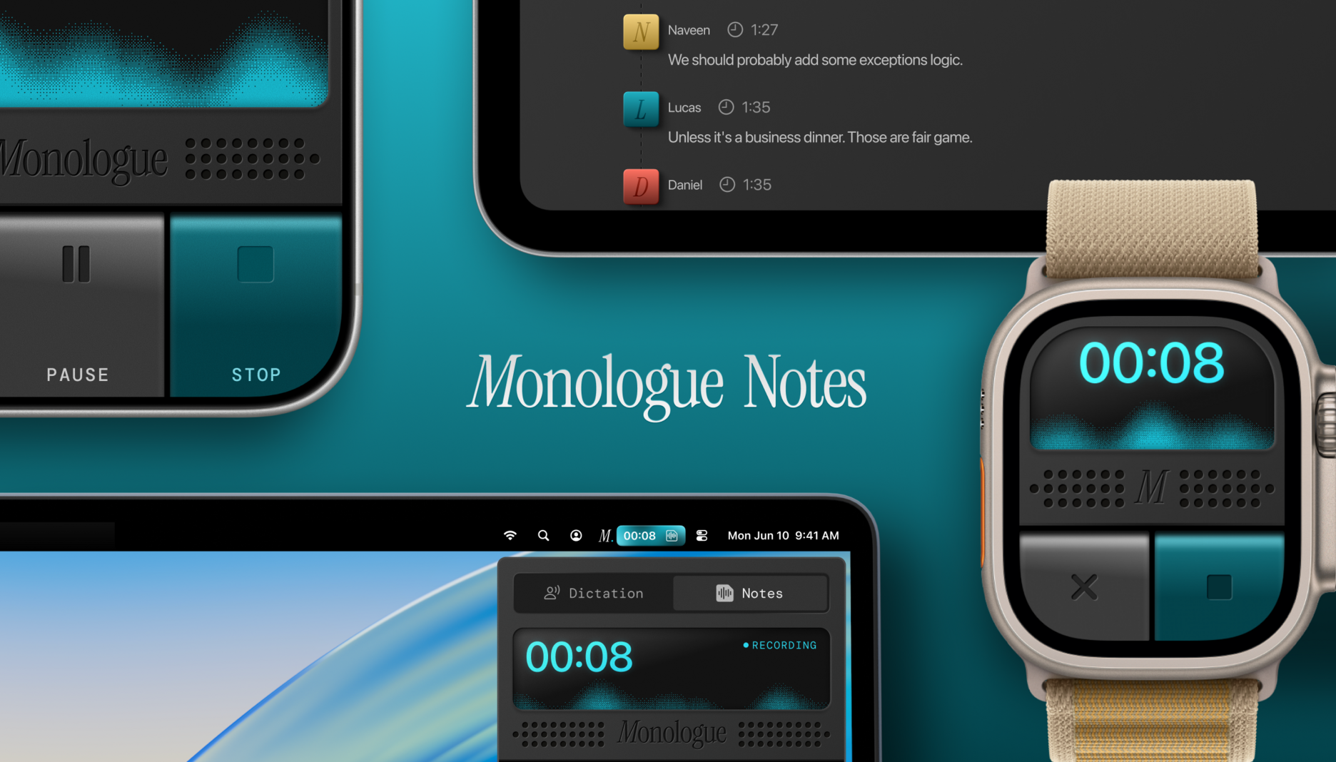 The best thinking rarely happens at a desk. It happens in meetings, on calls, or on walks—and then disappears. Monologue Notes, out today, records and transcribes all of it—the calls, meetings, and voice memos—and makes it available to the same agents and tools you use every day. It makes the thinking that happens in conversations and on walks just as actionable as the work you do at your desk.