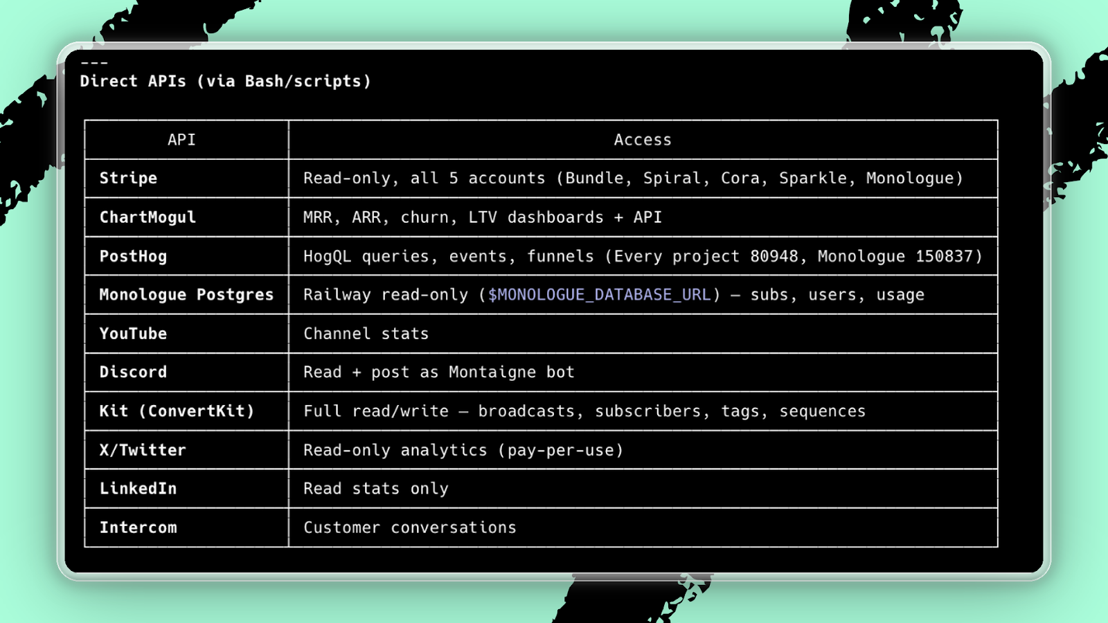 Montaigne lives in Claude Code on my terminal and as an OpenClaw bot on Slack. It has access to everything I use for growth work, including Stripe, PostHog, Slack, Notion, Figma, the full Every product suite, email, and calendar. It also has knowledge layers built on context about the business and a bench of skills for repeat workflows, giving the agent the tools to use that access with tremendous power.
