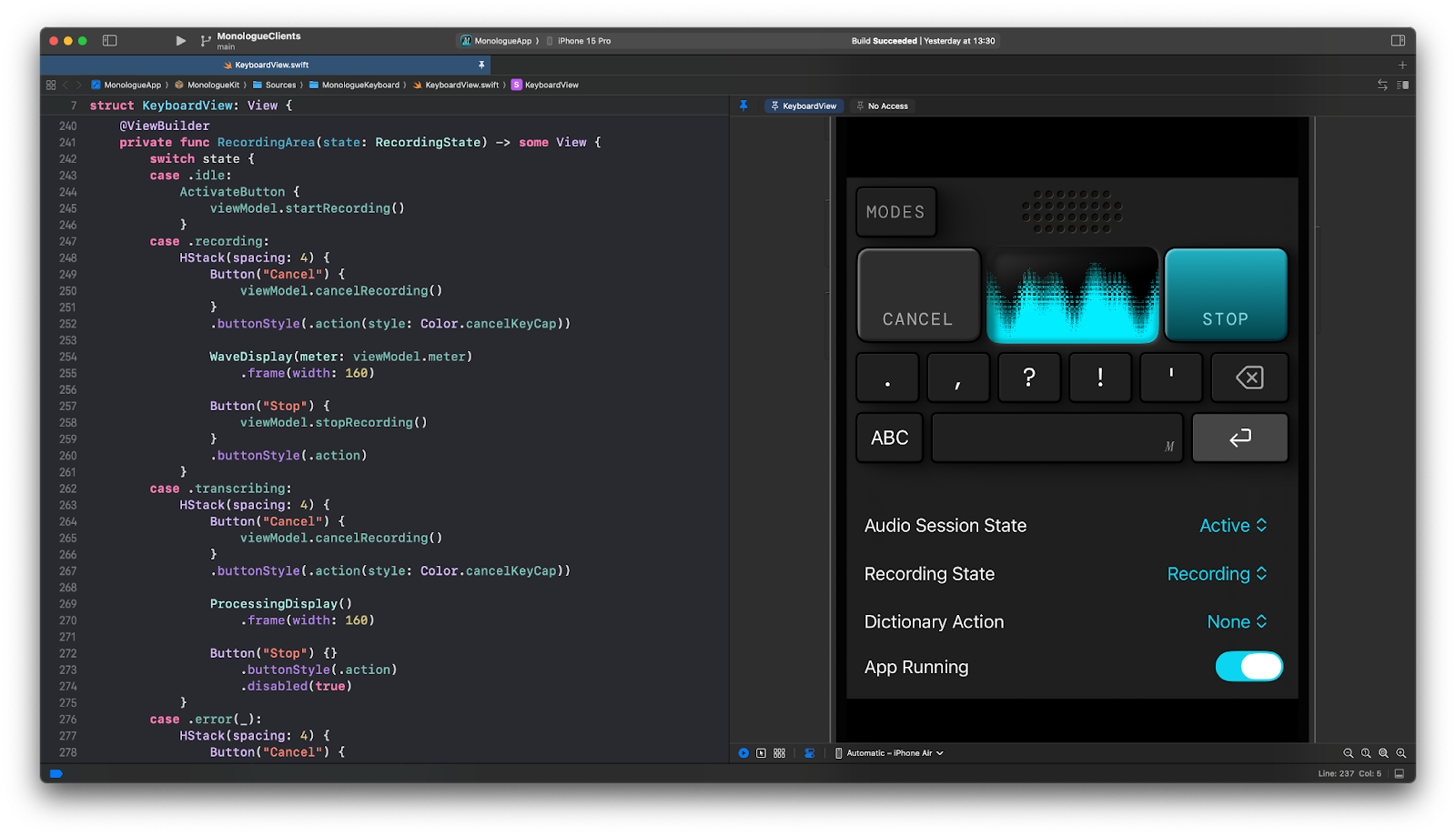 The onboarding is a user’s first contact with the app, and we wanted that moment to be a delightful one. The keyboard is what appears when you hit record with Monologue inside any app—it replaces your standard typing keyboard with one that transcribes your voice. The notes recorder is for longer, more open-ended capture, the place you’d go when inspiration about a side project strikes on a walk, and you need to get it down somewhere, stat. The keyboard and notes recorder are the screens users would use every day, the ones they’d remember.